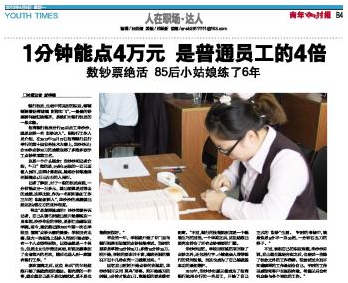 日前,《青年时报》、《新浪网》等媒体分别以“1分钟能点4万元,是普通员工的4倍”、“数钞票绝活 85后小姑娘练了6年”为主题专题报道了公司07届招商银行订单班员工华沙沙在点钞职业技能方面取得优异成绩,这是继tyc33455cc毕业生在邮政系统技能竞赛中获得优异成绩后,又为优质金融银领人才订单人才培养增添了隆重的一笔。