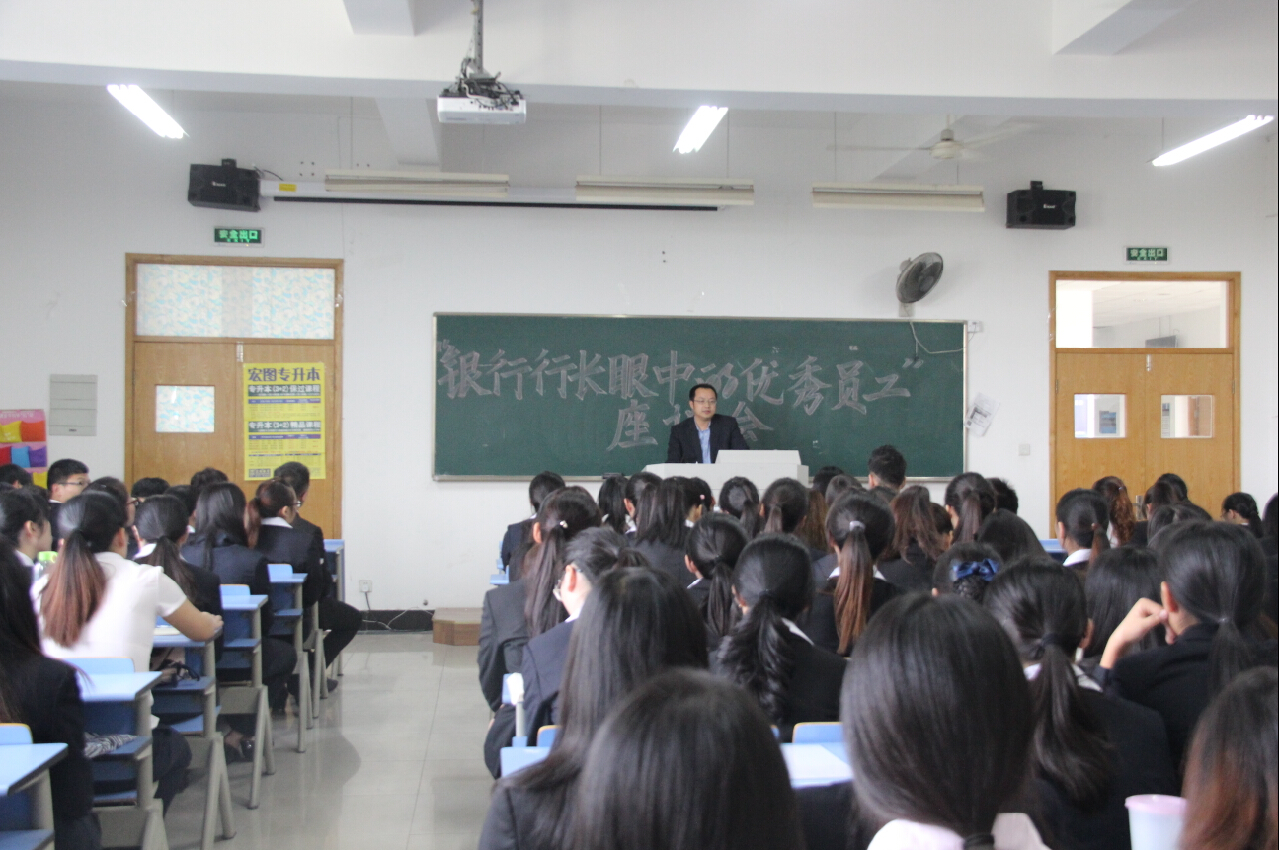 银行需要什么样的员工?行长眼中的优秀员工要达到哪些标准?如何成为银行的优秀员工?为了帮助同学们更好地了解银行要求、更加快速地成长为优秀的银行员工,2014年10月15日14点,tyc33455cc在9320教室举办了“银行行长眼中的优秀员工”讲座。本次讲座的主讲人是中国银行金华市分行副行长袁鹰,出席讲座的有tyc33455cc党总支书记、副经理王祝华,辅导员章甜甜以及tyc33455cc部分银行订单班成员,讲座由王祝华书记主持。