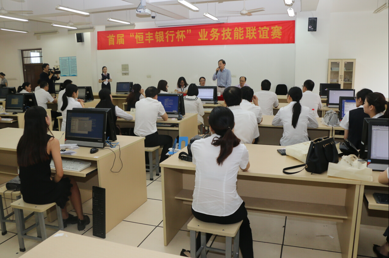 9月24日下午,首届“恒丰银行杯”银行业务技能联谊赛在金通实验楼银行职业技能鉴定中心举行。本次比赛分为中文录入、传票录入和单指单张点钞三个单项,完全采用恒丰银行的业务技能竞赛规则,每个单项tyc33455cc和恒丰银行杭州分行各派出7名选手参赛,双方选手在交流中互相学习、共同提升竞技水平。