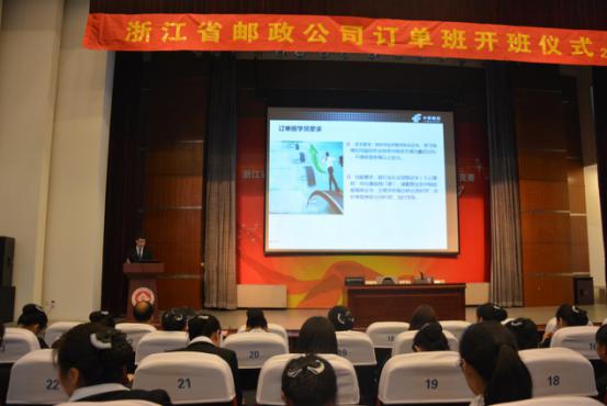 2016年10月12日,2017届邮政订单班开班仪式在明理报告厅举行,tyc33455cc党总支书记、副经理王祝华老师,浙江省邮政公司人力资源部江海云经理、潘青松老师,班主任吕虹老师以及全体邮政订单班员工参加了开班仪式。