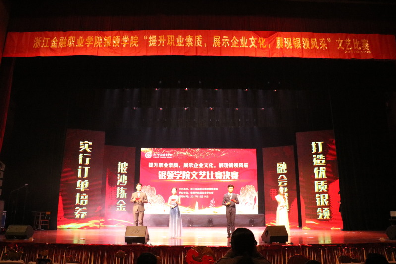 “提升素质,展现风采”文艺比赛的获奖情况如下:一等奖是民泰银行订单班的歌唱《消愁》,二等奖是杭州联合银行订单班的音乐剧《青春献礼,成长银领》,泰隆银行订单一班的华尔兹《赤道与北极》和村镇银行订单班的弄影戏《光阴的故事》;三等奖是金华银行订单班的小人舞《东方神娃》,民生银行订单班的舞蹈串烧:《moredance》,台州银行订单班的歌曲串烧《水调歌头+彩虹的微笑》,民生银行订单班的合唱《文淙南路的日子》,农村合作金融订单一班的合唱《仰望星空》以及泰隆银行订单二班的合唱《相亲相爱》。优胜奖是浙商银行订单班的歌伴舞《你变了,我没变》,农村合作金融订单二班的歌唱《匆匆那年》,邮政公司订单班的舞蹈《杯子舞》以及横店影视订单班的小品《考试风云》。