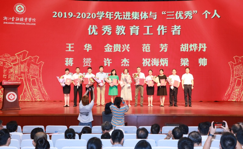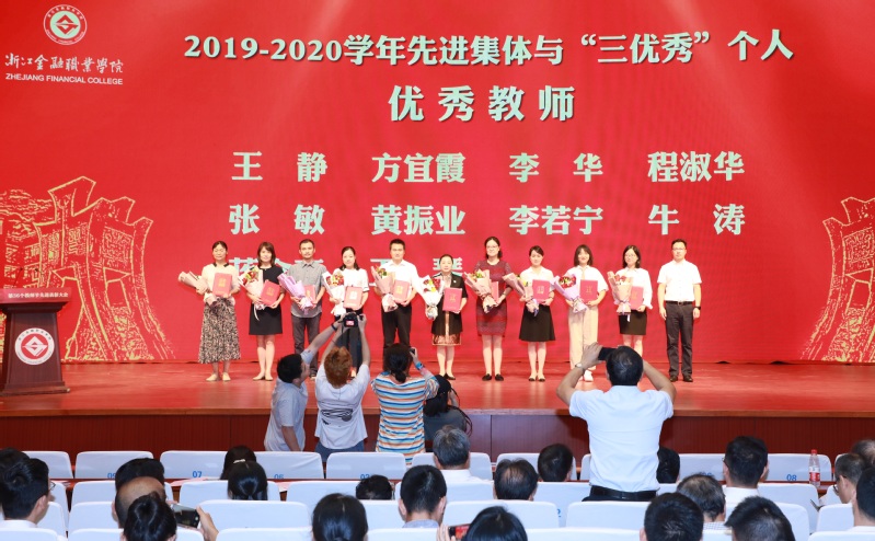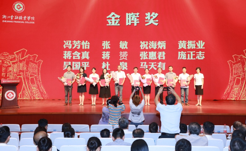 在大会上,公司举行了各类先进的颁奖仪式。公司对获得“浙江省巾帼建功标兵”荣誉称号、浙江省第十二届“挑战杯”老员工创业计划竞赛特等奖获奖团队的指导教师邵月花老师进行了表彰,党委书记周建松代表公司向她颁发了证书。同时,蒋赟老师被公司评为“优秀教育工作者”,被浙江省金融教育基金会授予“金晖奖”荣誉称号;蒋含真老师被公司评为“优秀教师”,被浙江省金融教育基金会授予“金晖奖”荣誉称号;金忠浩老师被公司评为“优秀班主任”。tyc33455cc职业礼仪教研室被公司评为“先进基层单位”。