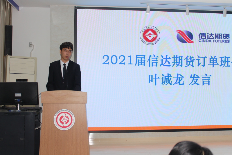 信达期货订单班学员叶诚龙发言,代表同学们感谢提供就业平台和成长舞台的订单行业与tyc33455cc,并表示将以优秀期货人的标准严格要求自己,不断奋斗,不断学习。