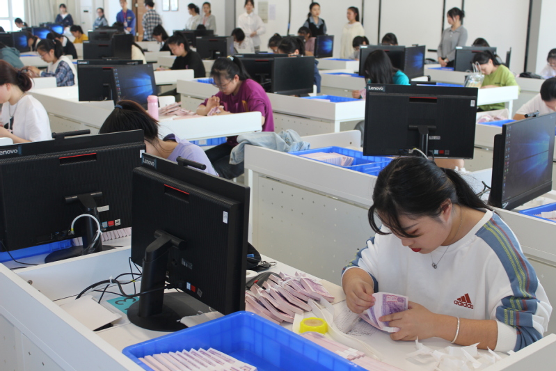 在金通401进行比赛的是点钞项目,“开始”口令一响,比赛选手迅速拆把清点,随着清脆的拨点声,选手们指尖如飞,钞券在指间快速滑落,犹如在弹奏一曲欢乐明快的乐曲。在金通101进行的比赛是中文输入和传票输入项目,同学们击键如飞,犹如行云流水,你追我赶。参赛选手规范操作、争分夺秒,“指尖如飞、我快谁追”的比赛现场展现了选手们高超的技能水平和良好的精神风貌。