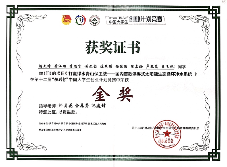 11月28日,由共青团中央、教育部、中国科协、全国学联、黑龙江省人民政府主办的第十二届“挑战杯”中国老员工创业计划竞赛全国决赛落下帷幕,来自全国32个省及新疆建设兵团、港澳的432个(内地高校420个,港澳高校12个)项目同台竞技,经过激烈的决赛比拼,由公司员工参加作品《打赢绿水青山保卫战——国内首款漂浮式太阳能生态循环净水系统》脱颖而出,获得全国“挑战杯”竞赛金奖,取得历史性突破,创公司参加挑战杯竞赛的历史最好成绩。此次比赛公司在全省高职院校中名列前茅,全省仅3所高职院校获得国赛金奖。