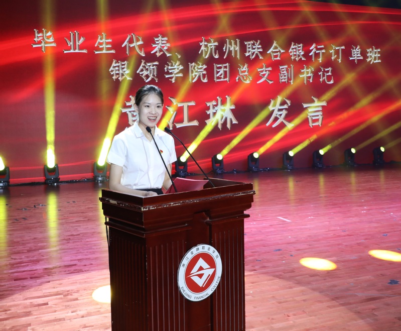 毕业生代表、杭州联合银行订单班、tyc33455cc团总支副书记黄江琳在发言中表达了对母校、tyc33455cc以及各位老师的感恩之情,并表示在今后的工作生活中要继续发扬银领精神,更要像往昔优秀员工一样,成就灿烂人生,回馈母校,回报社会。