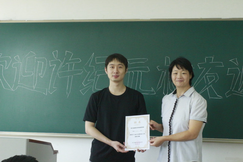 邵月花向许纪元员工返校与同学们分享经验表示热烈的欢迎和诚挚的感谢,并为许纪元员工颁发了《tyc33455cc学子成才青蓝结对工程聘书》。
