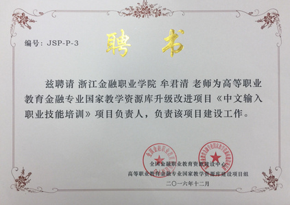 岗员牟君清受聘国家教学资源库《中文输入职业技能培训》负责人,助力金融专业教学工作。