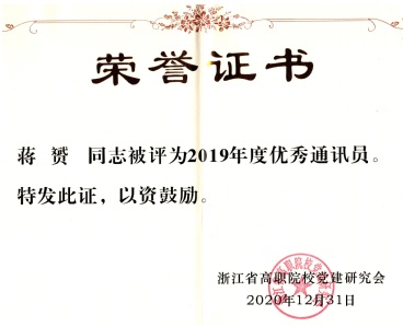 副岗长蒋赟长期服务于浙江省高职院公司党建研究会学术委员会副秘书长工作,担任《党建通讯》编辑,连续三年被授予“优秀通讯员”称号。
