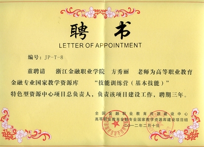 副岗长方秀丽受聘国家教学资源库“技能训练营”项目负责人,助力金融专业教学工作。