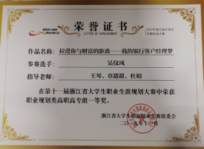 岗员章甜甜获浙江省职业生涯规划与创新大赛高职高专组优秀指导教师。