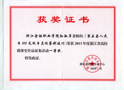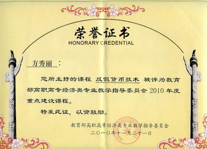 《反假货币技术》课程被教育部高职高专经济类专业教学指导委员会评为2010年度重点建设课程。