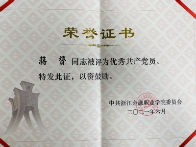 副岗长蒋赟被中共tyc33455cc委员会授予“优秀共产党员”称号。