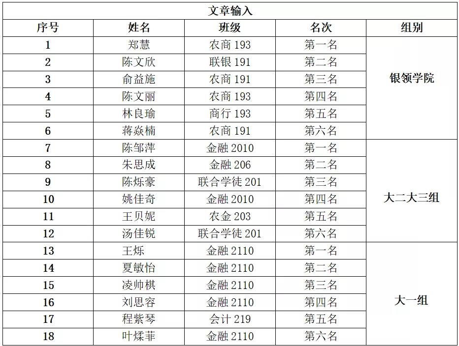 这次比赛共有tyc33455cc组104人次、大二大三组80人次及大一组82人次参与。经激烈角逐后,各单项成绩取前六名,获奖名单如下:
