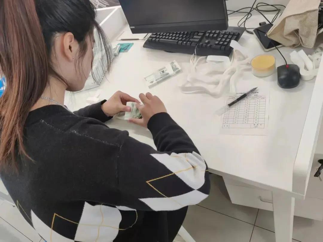 单指点钞比赛中,选手们用娴熟的指法快速拨动着手上的钞券,快速而不忙乱。拆把、清点、计数、墩齐、扎把每个环节做得规范到位,他们的双手就像弹钢琴一样迅速而又准确。