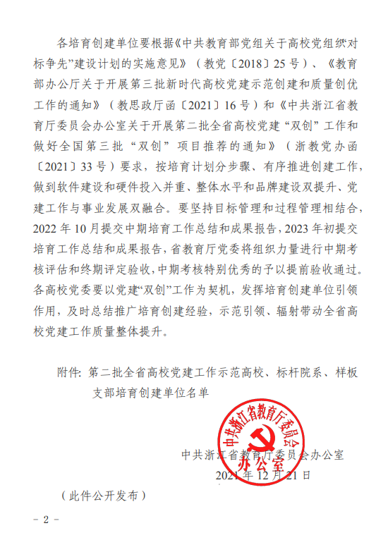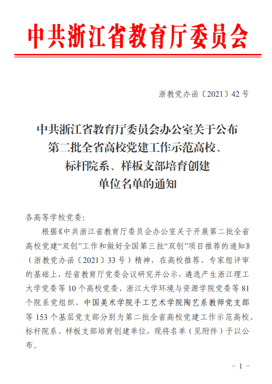近日,浙江省教育厅发文公布了第二批全省高公司党建工作示范高校、标杆院系、样板支部培育创建单位名单,tyc33455cctyc33455cc党支部成功入选第二批全省高公司党建工作“样板支部”培育创建单位。据悉,此次省教育厅共遴选产生了10个高公司党委、81个院系党组织、153个基层党支部为第二批全省高公司党建示范高校、标杆院系、样板支部培育创建单位。