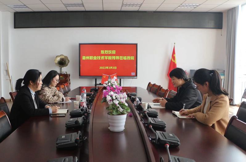3月3日下午,衢州职业技术公司学工部副部长裘俊、医公司党总支副书记周贞莅临tyc33455cc交流学习,tyc33455cc党总支书记、常务副经理邵月花热情接待。