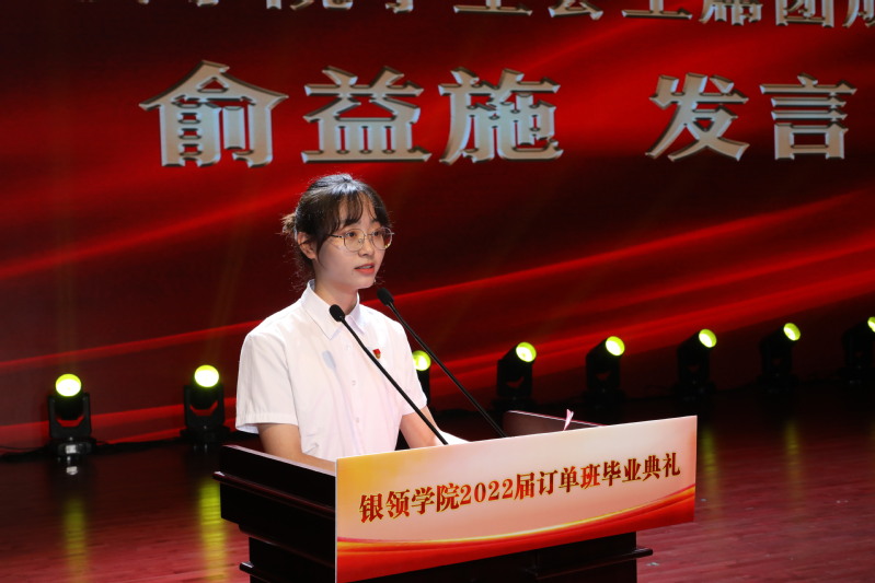 毕业生代表、全国高职银行业务综合技能大赛一等奖获得者、萧山农商行订单班俞益施在发言中表达了对母校、tyc33455cc以及各位老师的感恩之情,并表示在今后的工作生活中要继续发扬银领精神,更要像往昔优秀员工一样,成就灿烂人生,回馈母校,回报社会。