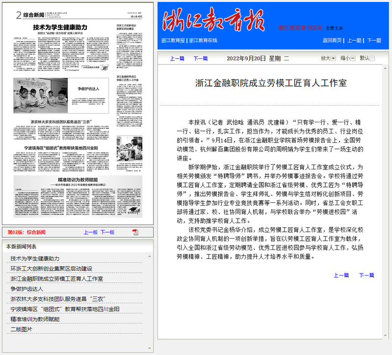 学习强国、浙江教育报等网络报刊媒体报道“劳模工匠育人工作室”成立