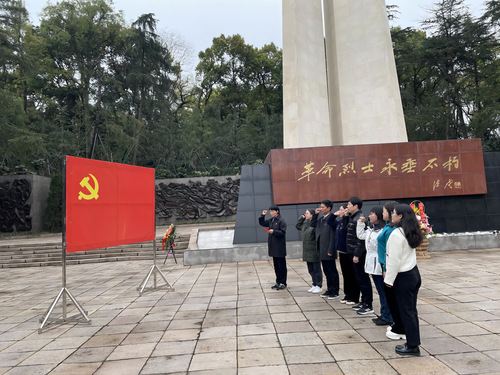 在庄严肃穆的烈士纪念碑前,支部党员们整齐列队、唱《中华人民共和国国歌》、鞠躬致敬,党员代表向烈士敬献花篮,邵月花、蒋赟上前整理挽联。邵月花带领大家绕行烈士碑一周,告慰烈士忠魂,寄托对烈士的无限哀思。随后,邵月花带领党员们面对烈士雕像,在庄严的党旗下,全体高举右手,重温入党誓词。