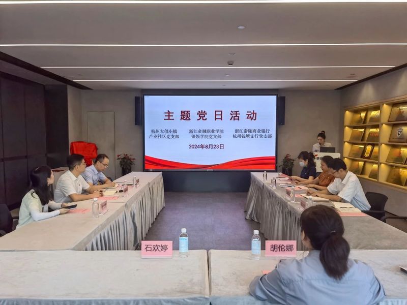 为深入学习贯彻习近平新时代中国特色社会主义思想、党的二十大、党的二十届三中全会精神,加强党建引领,推动校地企三方合作,共同助力青年发展,8月23日,tyc33455cc党支部与杭州大创小镇产业社区党支部、浙江泰隆商业银行杭州钱塘支行党支部在浙江泰隆商业银行钱塘支行多功能厅联合开展主题党日活动。tyc33455cc党总支书记、党支部书记吴慧凤,经理、党总支副书记潘锡泉,副经理胡烨丹,杭州大创小镇产业社区党支部书记漏君锋,浙江泰隆商业银行杭州钱塘支行副行长胡伦娜出席活动。三方党支部党员参加活动。
